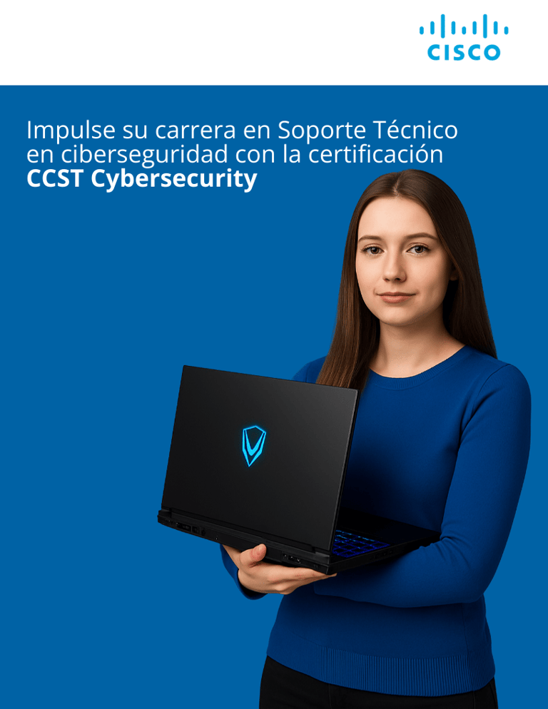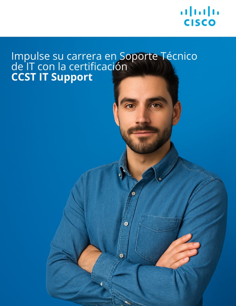 La certificación Cisco Certified Support Technician (CCST) IT Support valida los conocimientos básicos necesarios para desempeñarse en roles de soporte técnico. Cubre temas como hardware, software, sistemas operativos, redes básicas, seguridad y atención al cliente.